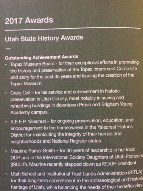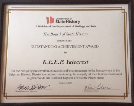 The Utah Division of State History recognized K.E.E.P. Yalecrest at its 65th Annual State History Conference during an awards luncheon on Oct. 11, 2017. Current and past board members were in attendance to accept the award. It is an honor to be recognized by the State for our accomplishments and continued efforts!