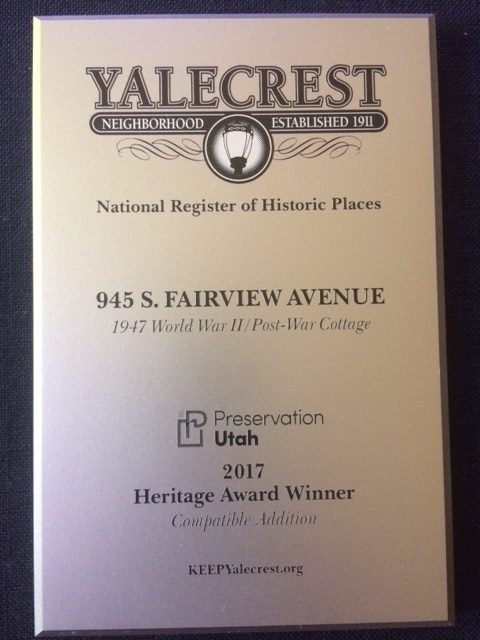 K.E.E.P. Yalecrest partners with Preservation Utah and provides these plaques to Heritage Award Winners who reside in Yalecrest.