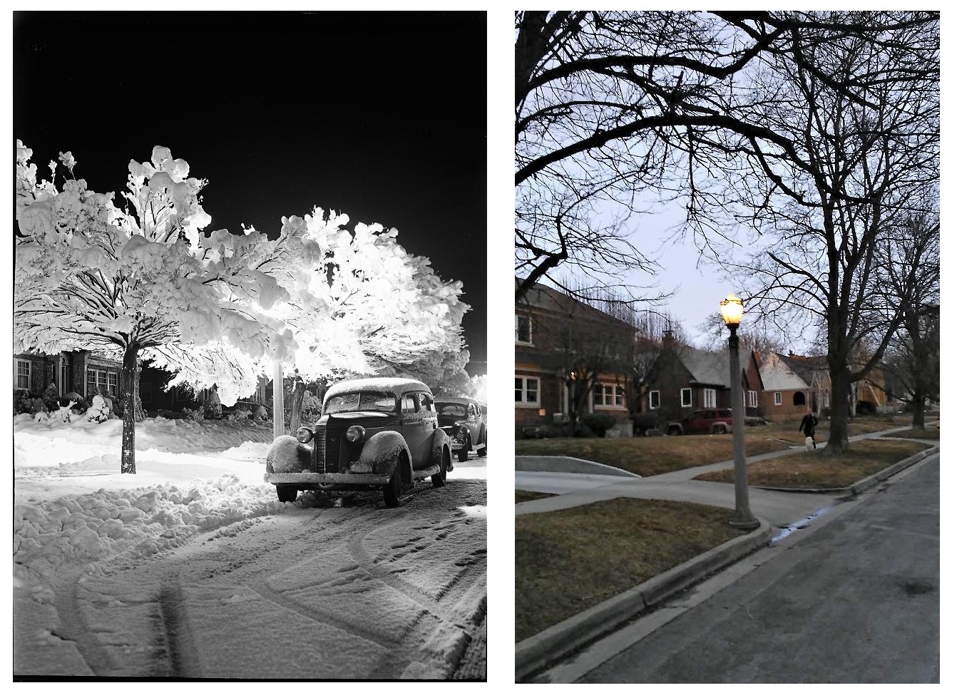 Left: Snow-Covered Trees Illuminated by Street Lamp Looking East from 1751 Yalecrest Avenue, January 7, 1940; Right: Same Location, February 25, 2019